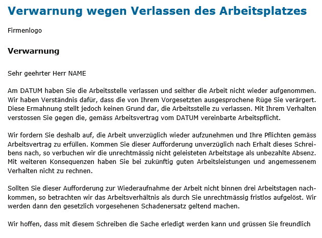 - Verwarnung mit Androhung der fristlosen Kündigung (inkl. Merkblatt)