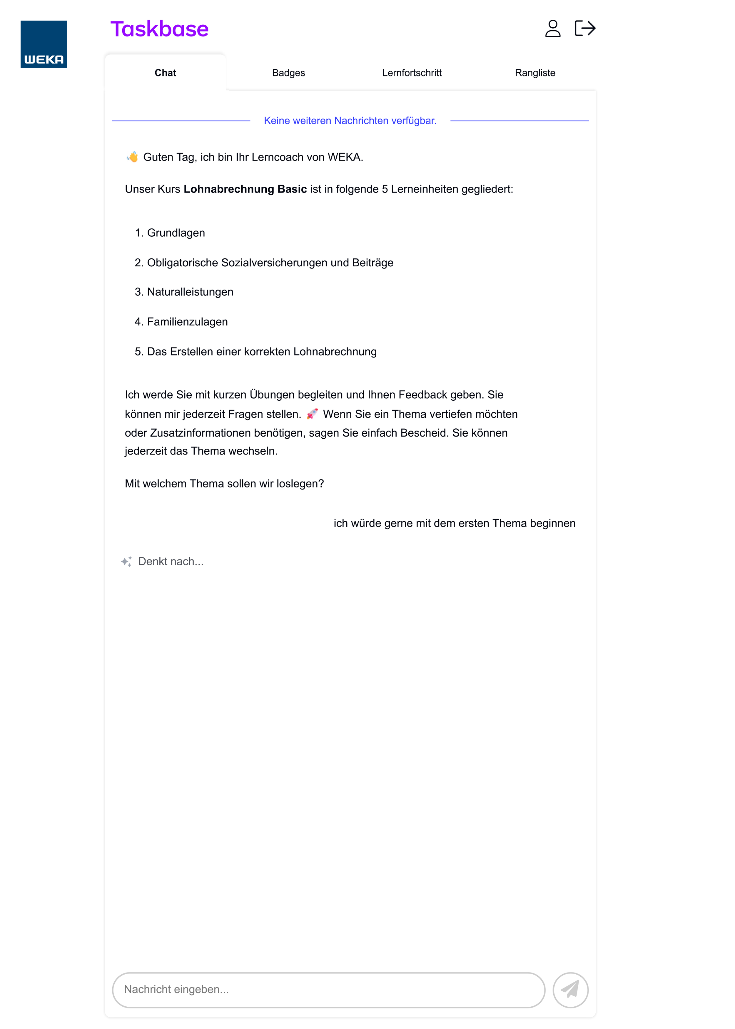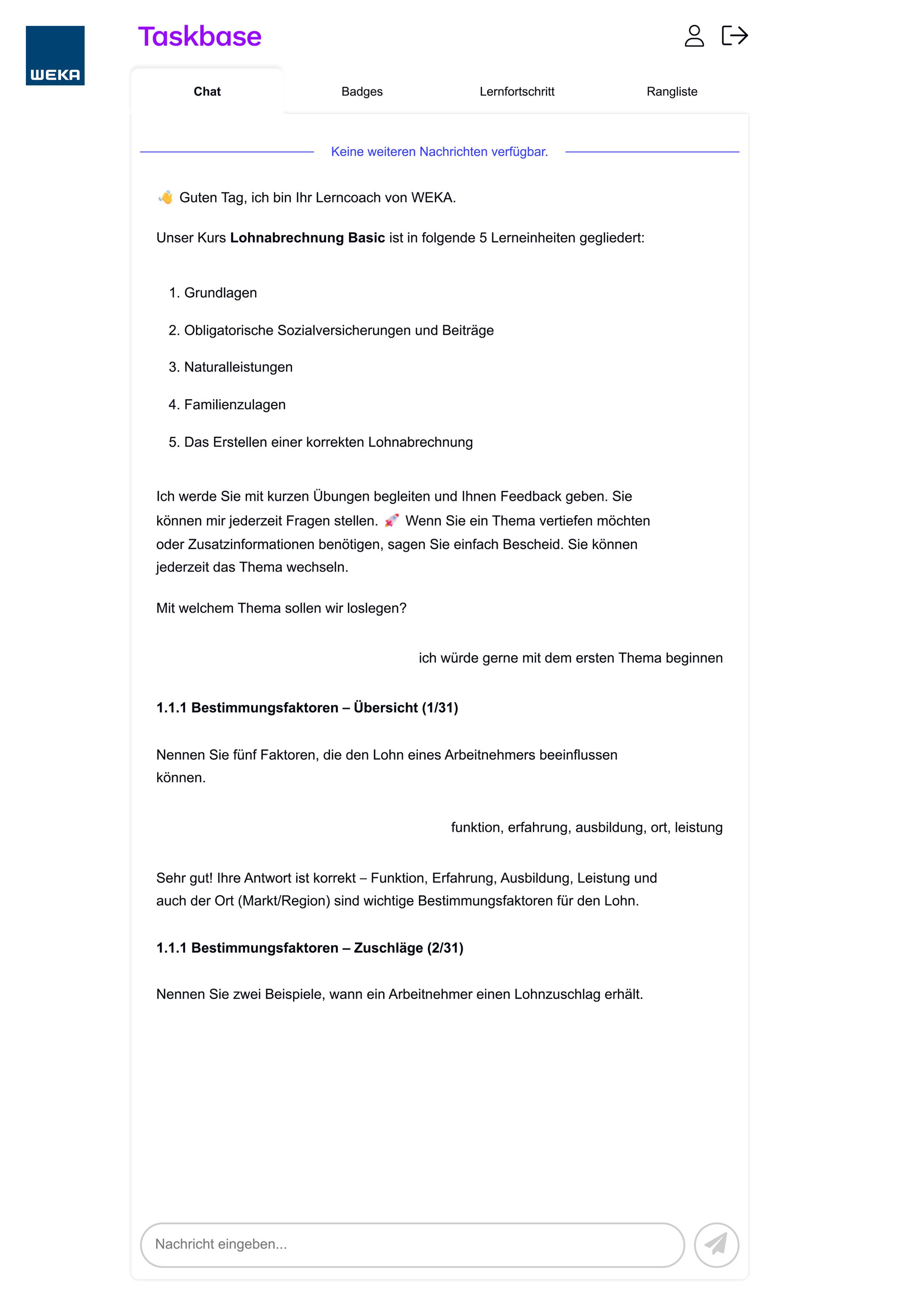 Das KI-Training begleitet Sie Schritt für Schritt, Lernsequenz für Lernsequenz und stellt die Verankerung Ihres Wissens zur Lohnabrechnung mit allen Facetten sicher. In Ihrem persönlichen digitalen Lernraum lernen Sie in Ihrem eigenen Tempo – orts- und zeitunabhängig.