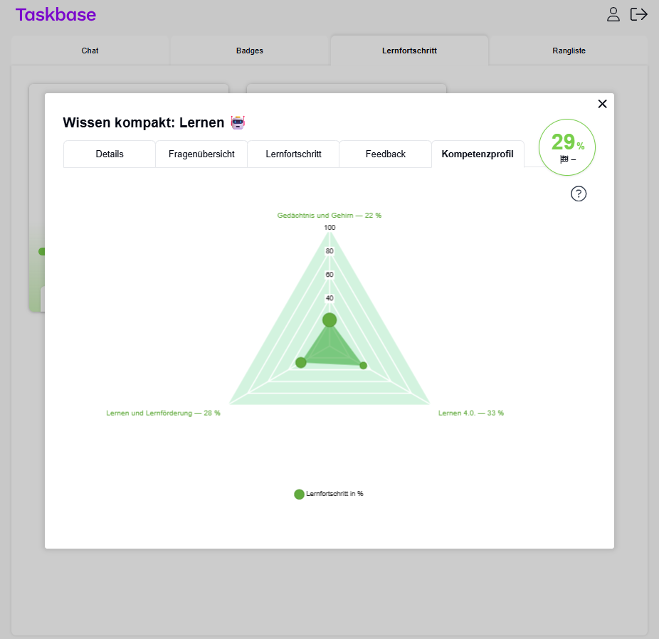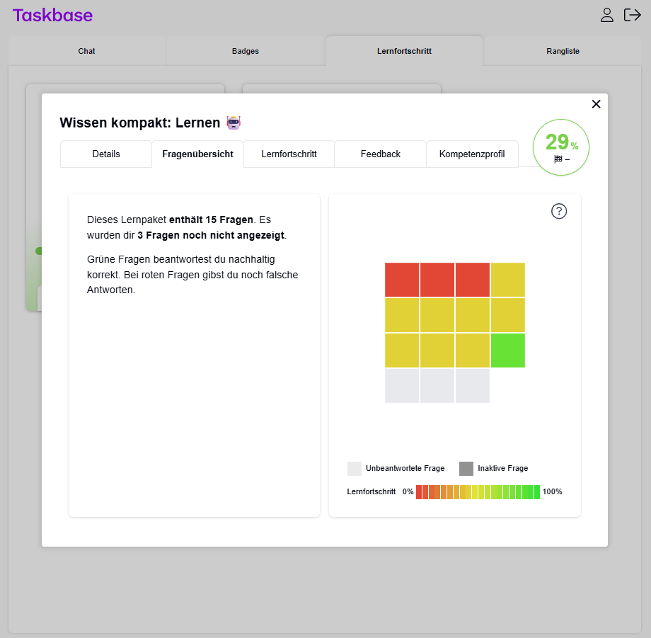 Ihr persönlicher Lerncoach fragt Ihr Wissen gezielt ab, gibt Ihnen Lern-Tipps, stellt Wissenslücken fest und schlägt Vertiefungen oder Wiederholungen vor. Sie lernen, trainieren und validieren hochwertiges Know-how mit Hilfe des integrierten Lerncoachs. Als Sparringpartner begleitet er Sie im Praxisalltag und hilft Ihnen, Fragen und Unsicherheiten schnell zu klären. So bleibt Ihr neu erworbenes Know-how noch besser verankert!