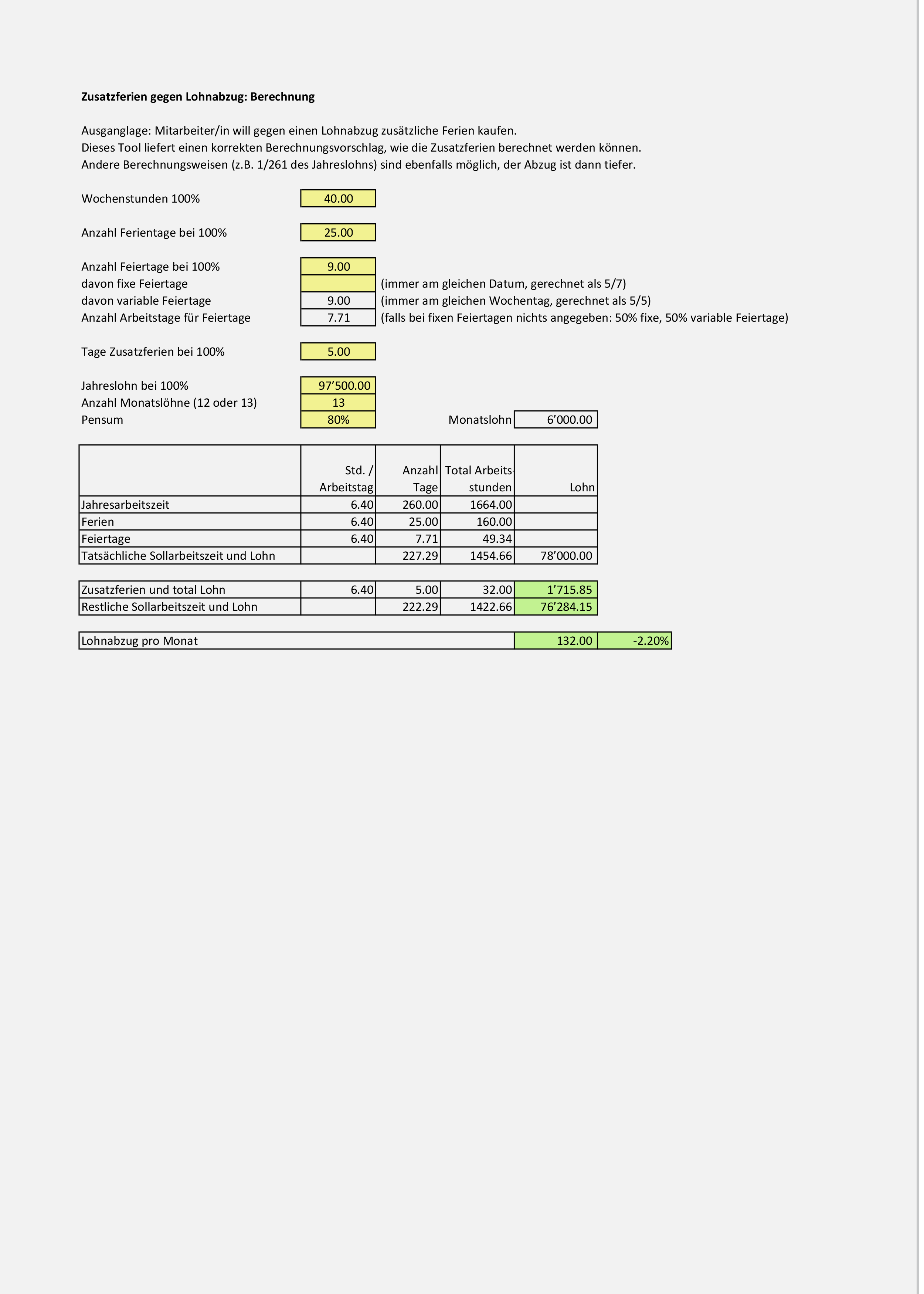 Dieses Excel-Tool ermöglicht eine exakte Berechnung des Lohnabzugs, wenn Mitarbeitende zusätzliche Ferientage erwerben möchten. Das Tool berücksichtigt alle relevanten Berechnungsgrundlagen und bietet eine transparente Entscheidungsgrundlage für Arbeitgebende und Mitarbeitende.