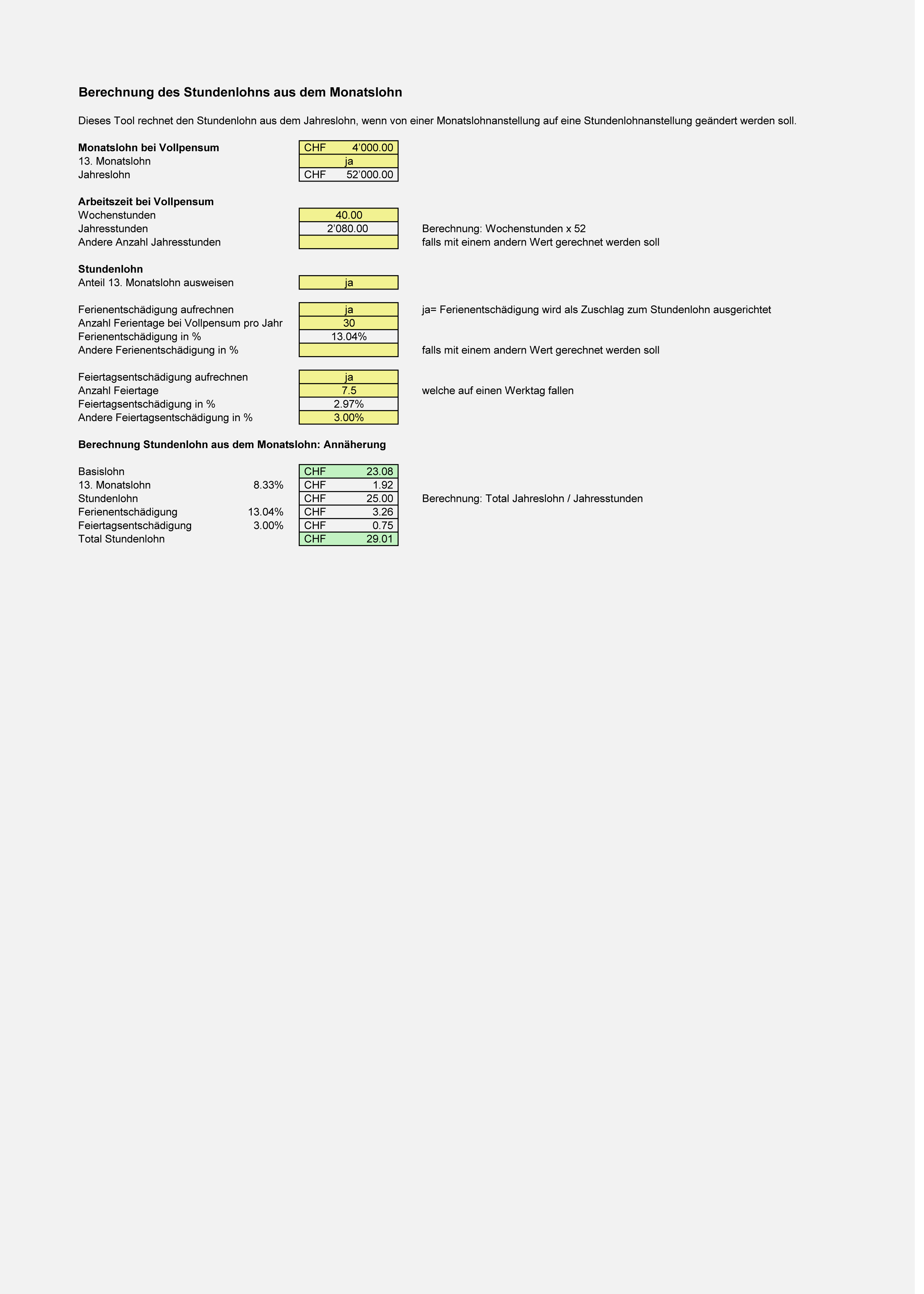 In der Lohnabrechnung muss häufig der Stundenlohn aus dem Monatslohn berechnet werden, sei es weil die Monatslohnanstellung auf eine Stundenlohnanstellung geändert wird, Mehr- und Überstunden oder Ferientage am Ende des Arbeitsverhältnisses ausgezahlt werden.