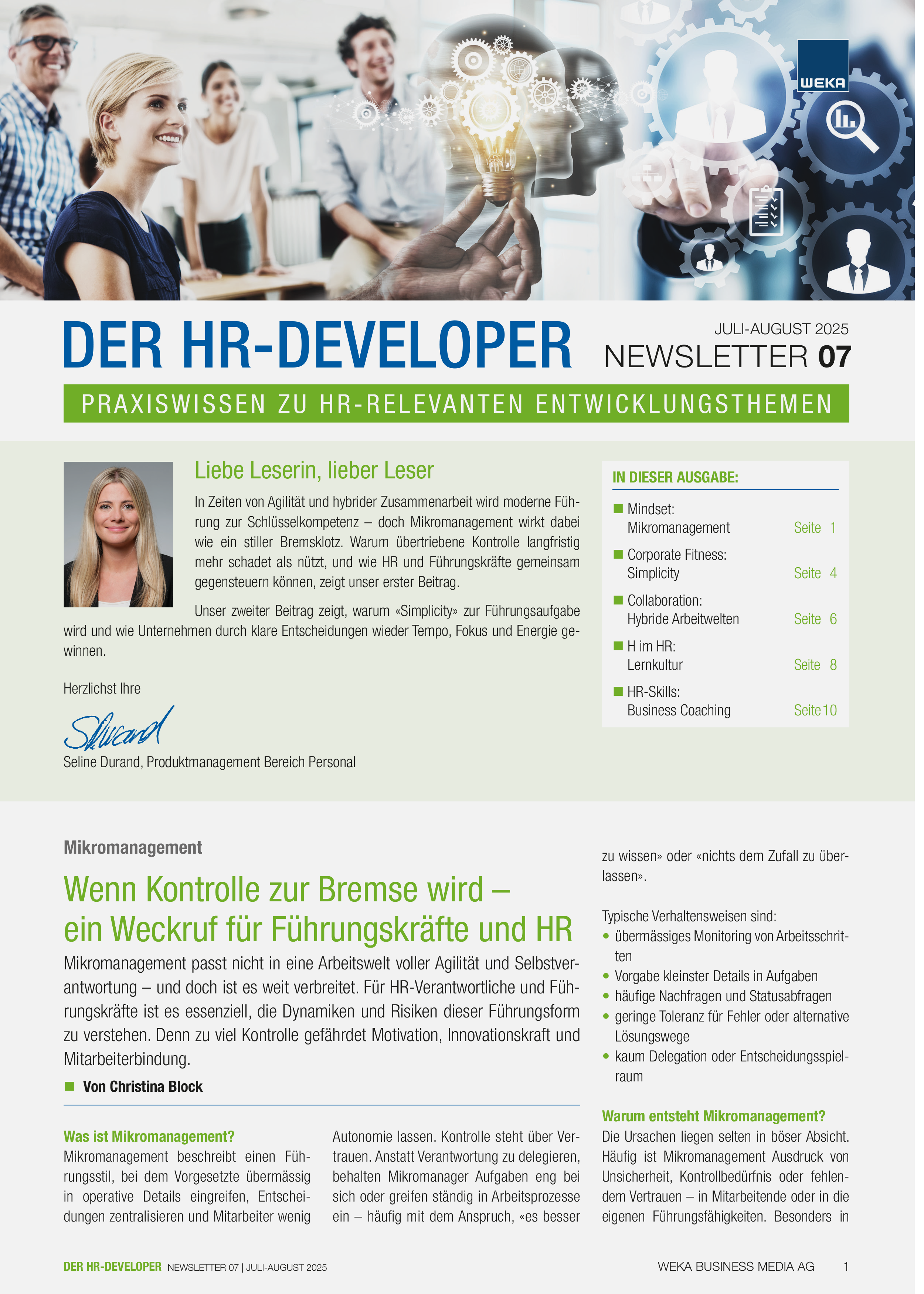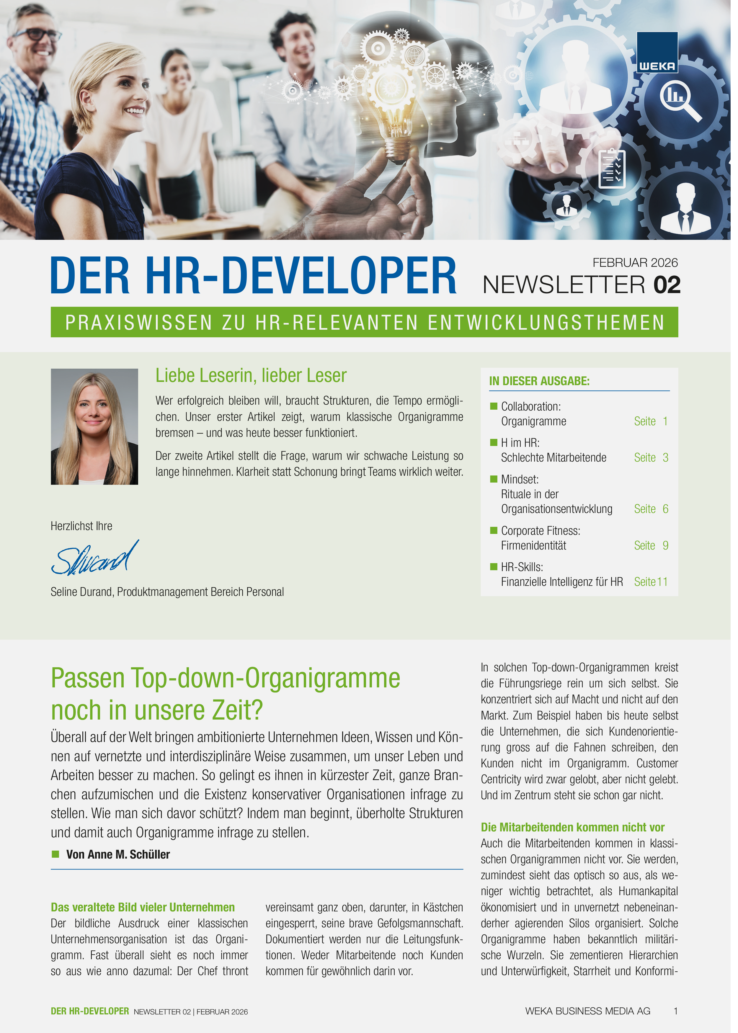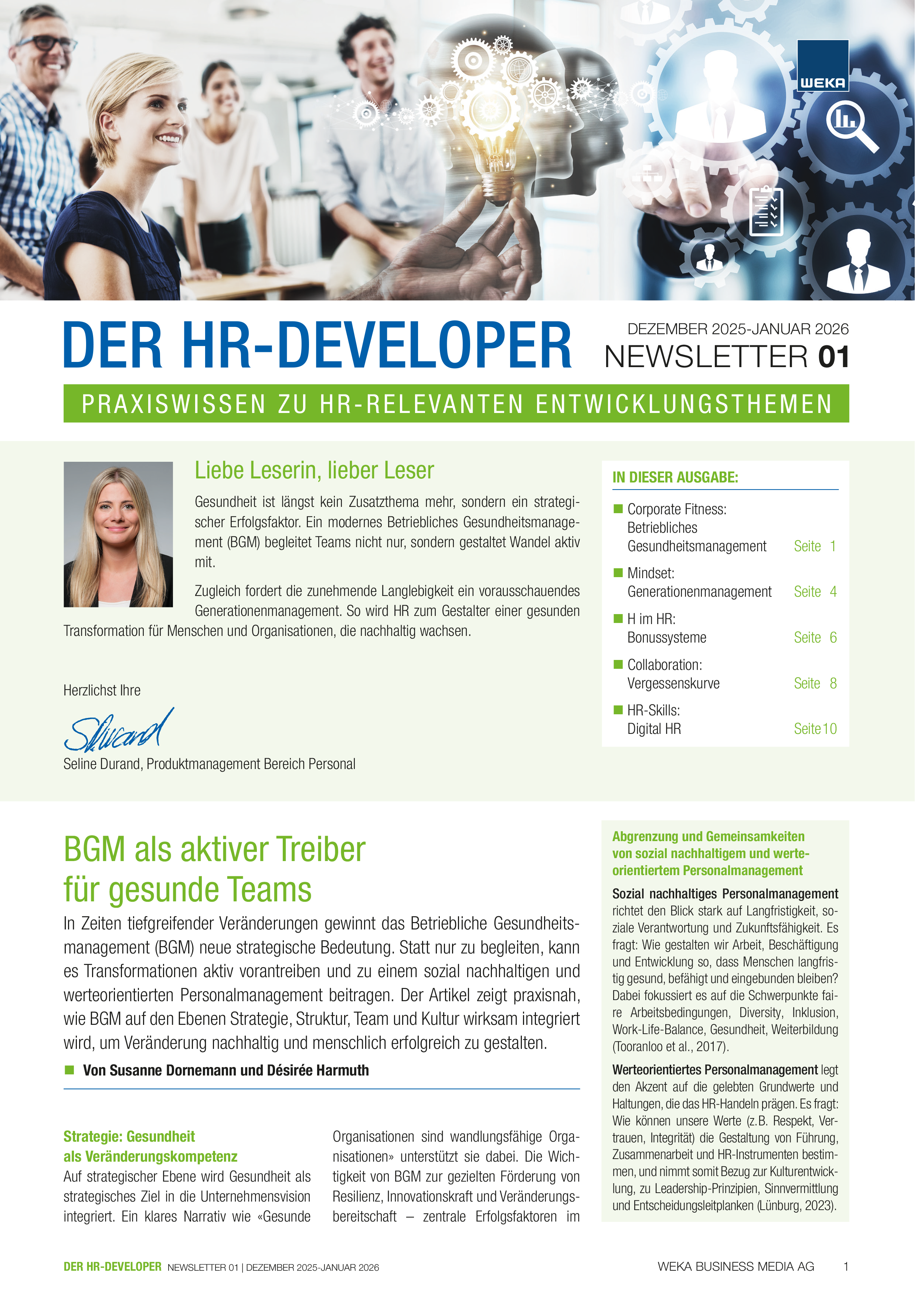 Mit diesem Newsletter erwartet Sie 10 Mal pro Jahr konkretes Praxiswissen zu HR-relevanten Entwicklungsthemen, welches Sie bei Ihren weitreichenden Aufgaben unterstützt und sensibilisiert. Mit den definierten Rubriken Corporate Fitness, Mindset, Collaboration, H im HR, HR-Skills und HR@work werden Zukunftsimpulse aufgegriffen und Ihnen praxistauglich und kompakt näher gebracht. So sind Sie für alle zukünftigen Herausforderungen der Arbeitswelt bestens gerüstet!