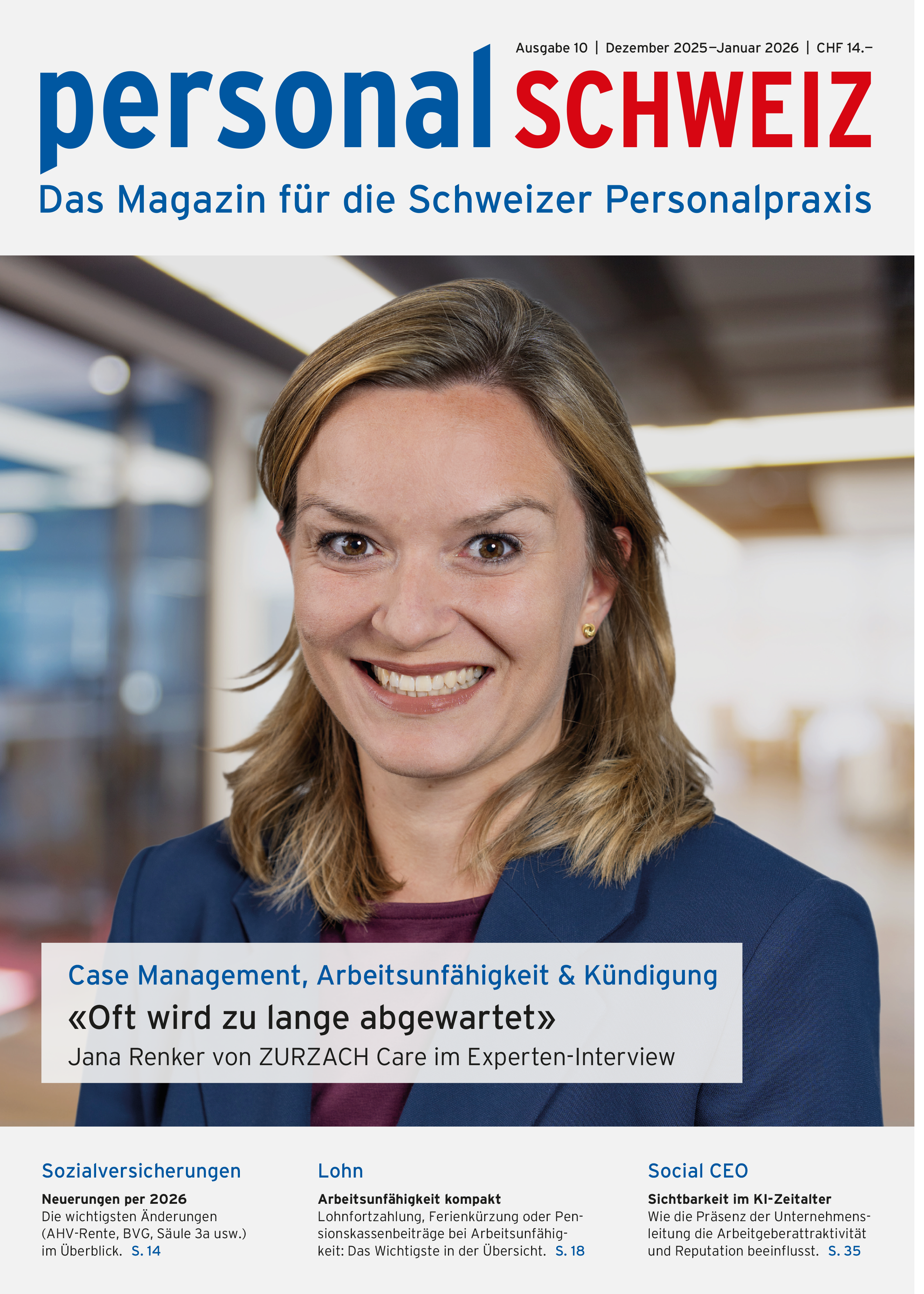 Mit jeder Ausgabe von personalSCHWEIZ erhalten Sie topaktuelle HR-Best-Practice, Know-how und Trends, die Sie und Ihre Mitarbeitenden weiterbringen. Praxisnahe Beiträge aus dem Arbeitsrecht und zu Lohn und Sozialversicherung beantworten Ihnen die Fragen, die Sie im Alltag beschäftigen. Wertvolle Tipps zu Karriere und Mitarbeiterführung helfen Ihnen, die vielfältigen Anforderungen als Personalverantwortliche/r souverän und erfolgreich zu meistern.