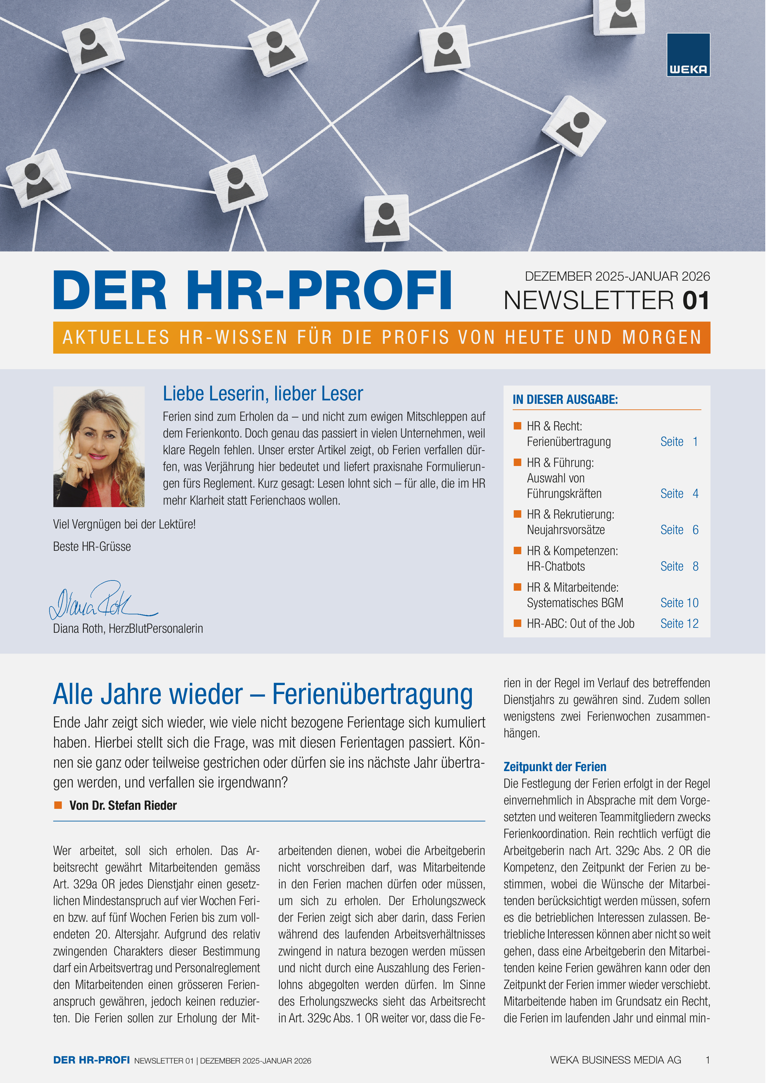 In diesem Newsletter erwarten Sie 10 Mal pro Jahr zahlreiche Praxistipps und Vorgehensweisen sowie nützliche Vorlagen für Ihren HR-Alltag. Mit den Rubriken erhalten Sie über die ganze HR-Breite genau das Wissen, welches Sie benötigen, um konkrete operative Aufgaben schnell und kompetent zu erledigen. So verschaffen Sie sich den entscheidenden Wissensvorsprung!