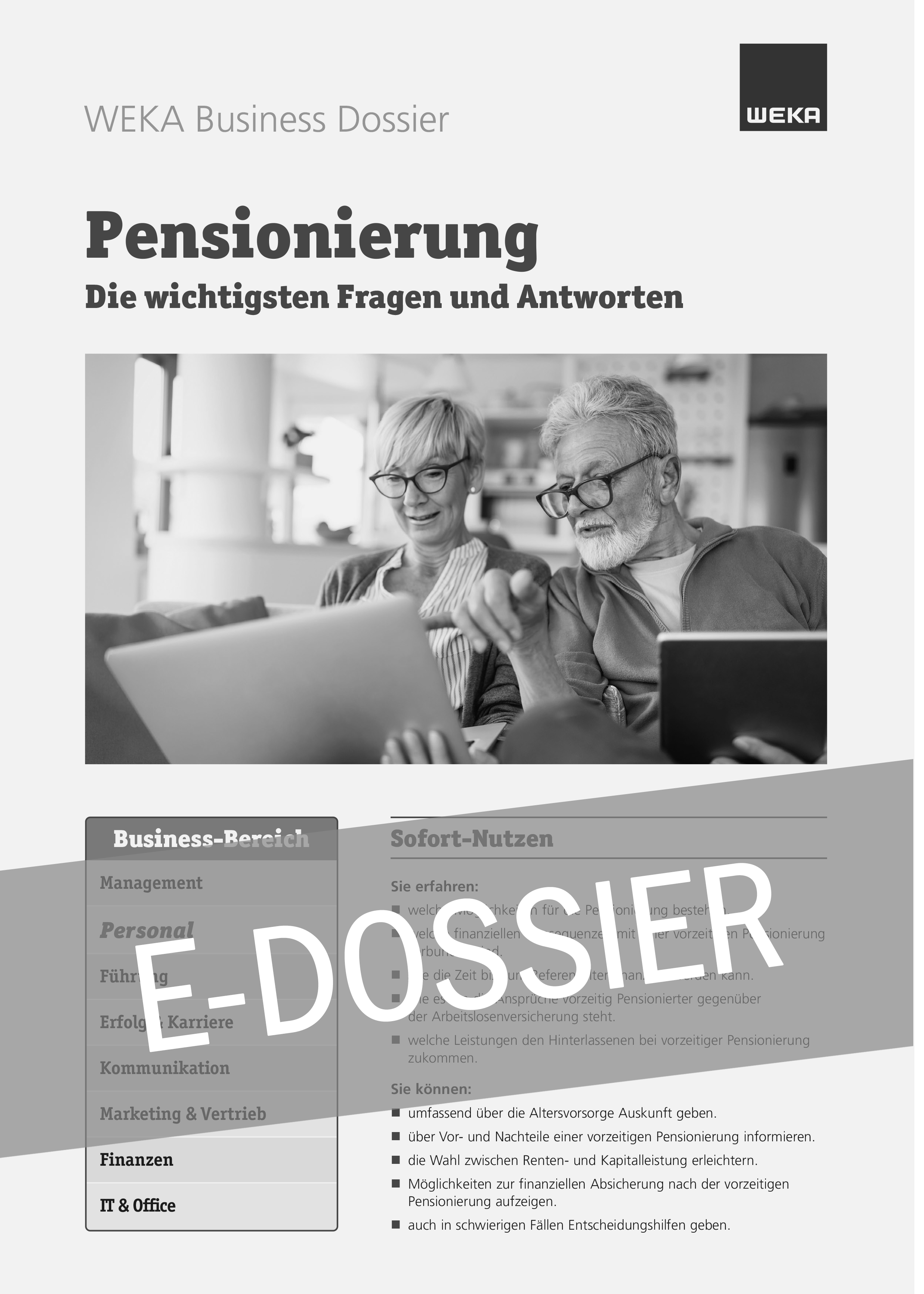 Dieses E-Dossier unterstützt Sie dabei, Ihre Mitarbeitenden professionell und umfassend zu beraten hinsichtlich des Reglements der Vorsorgeeinrichtung, der eigenen Vermögenssituation, des gewünschten Lebensstandards nach der Pensionierung und auch in Fragen zur vorzeitigen Pensionierung.