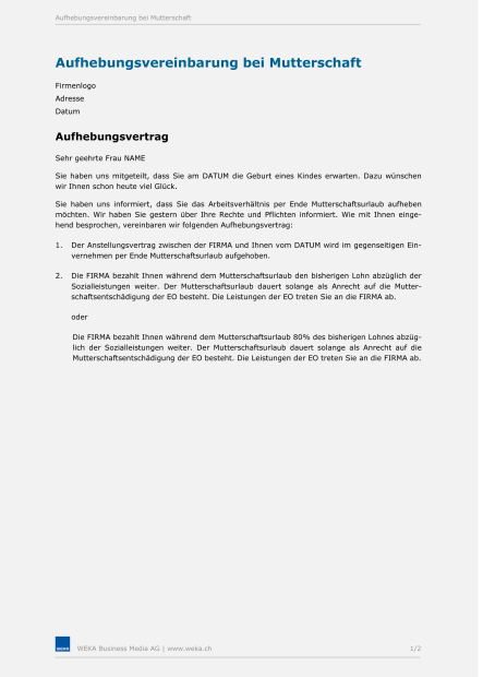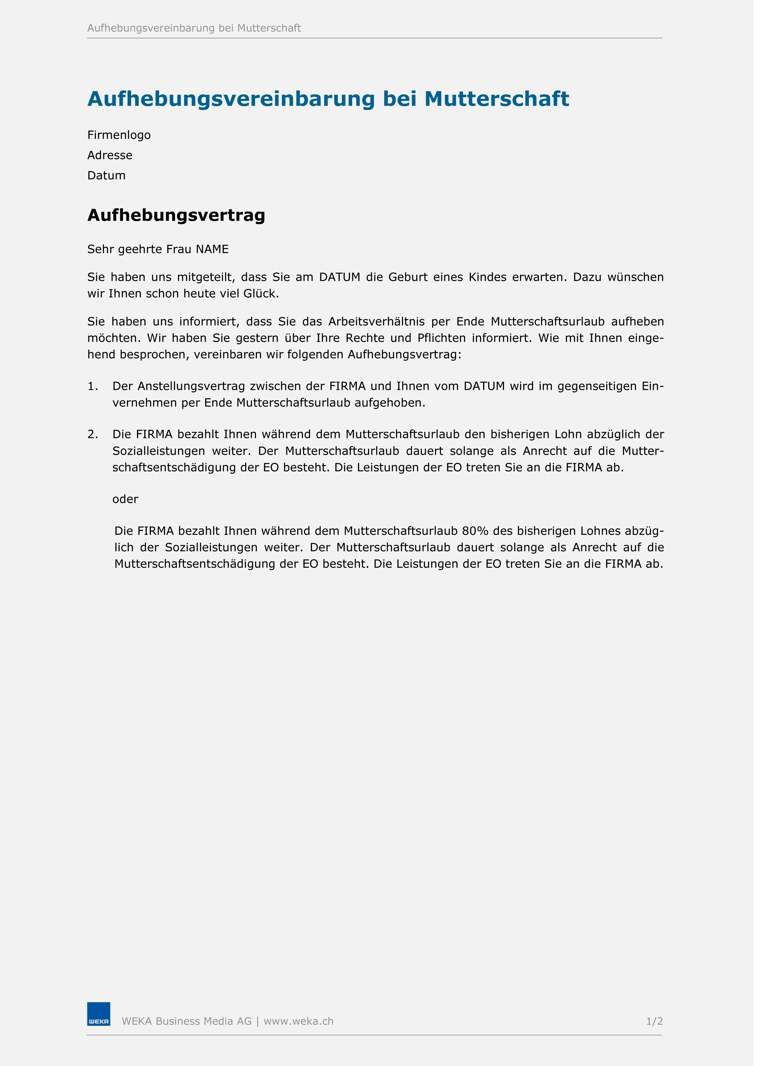 - Muster Aufhebungsvereinbarung bei Mutterschaft