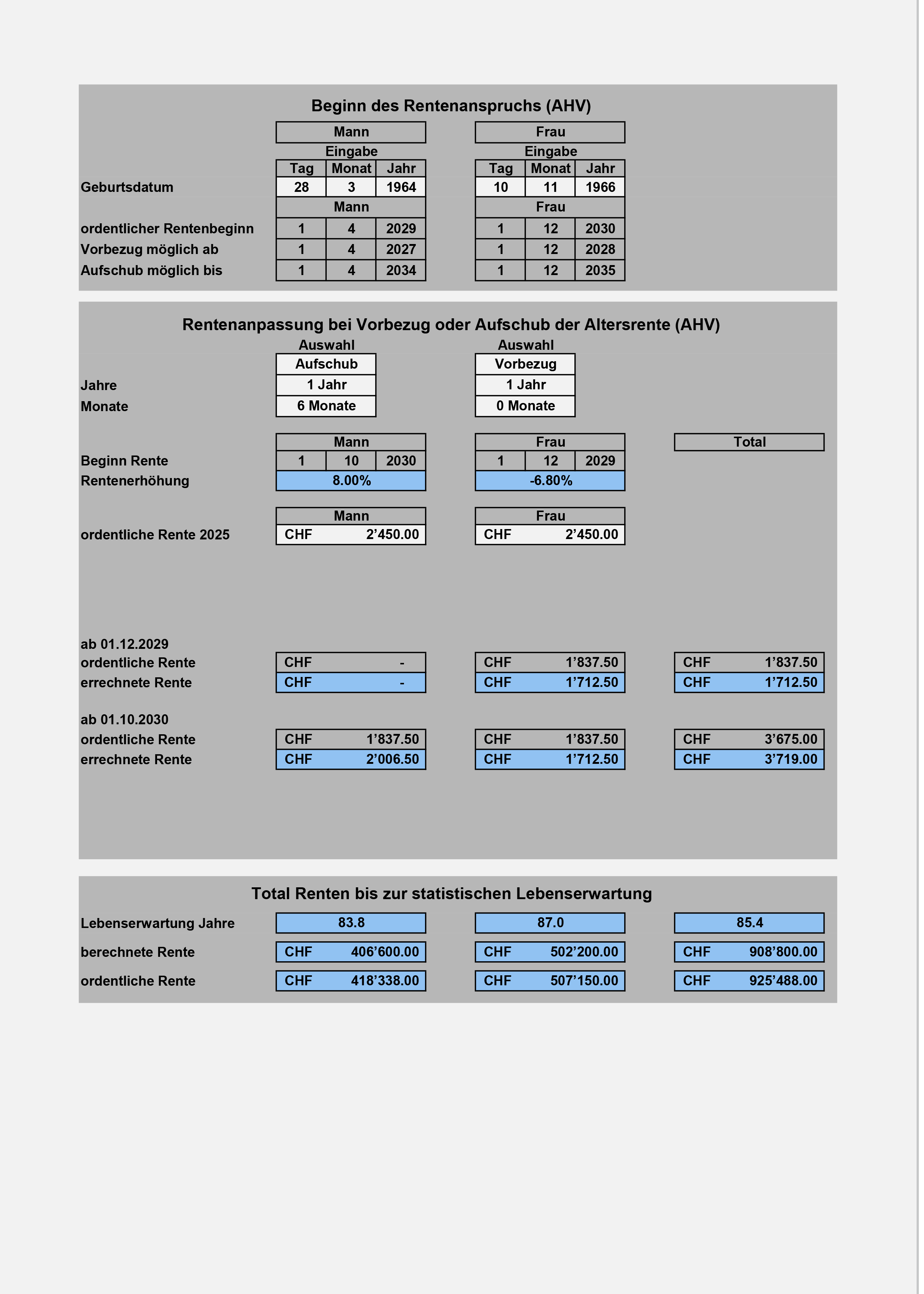 Dieses Excel-Tool ermöglicht eine präzise Berechnung der Rentenkürzung, wenn die Altersrente der AHV vor dem ordentlichen Rentenalter bezogen wird. Sie können auch dir Rente bei einem Aufschub berechnen. Es liefert eine transparente Grundlage für die individuelle Entscheidungsfindung rund um den AHV-Vorbezug.