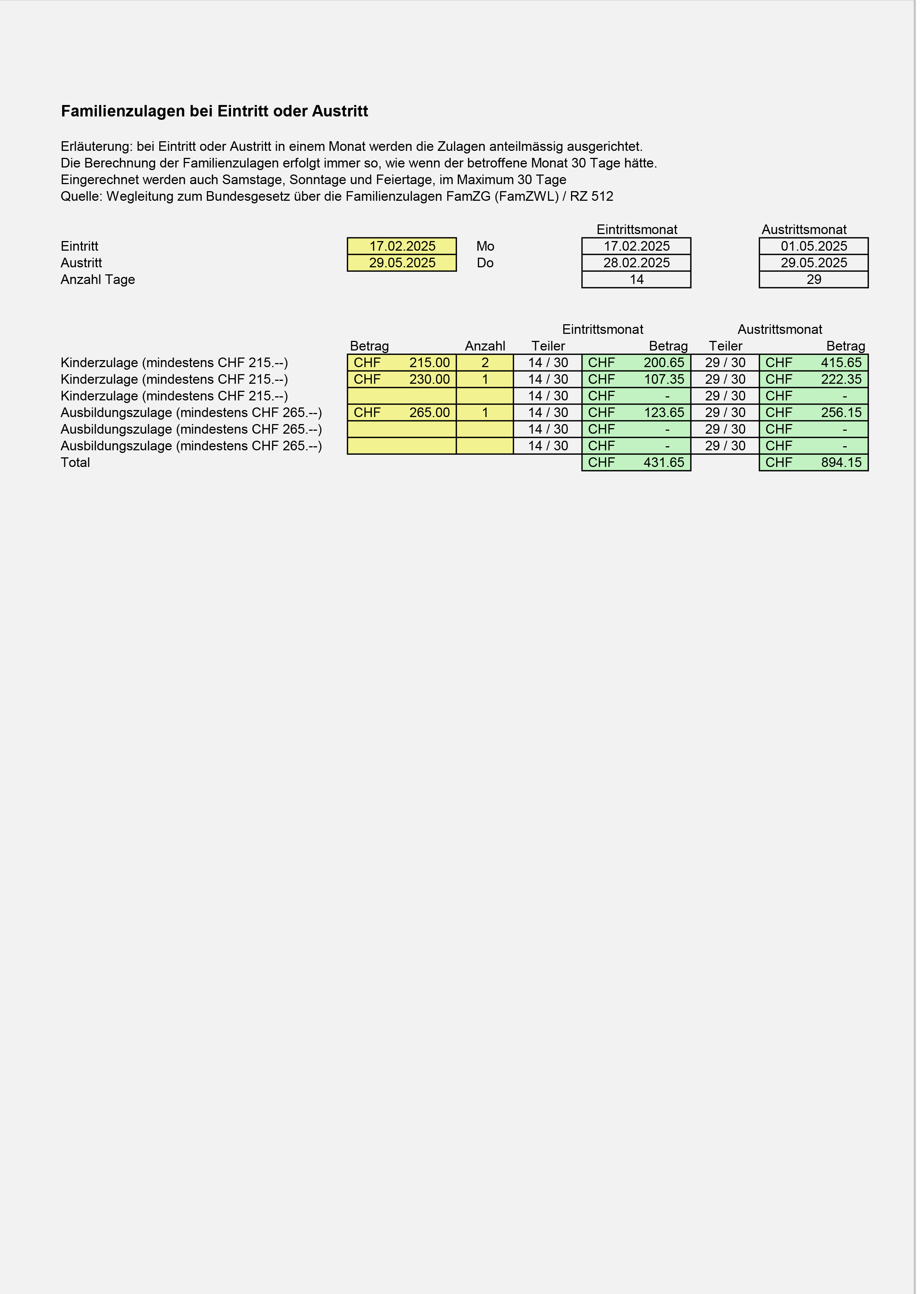 Bei Eintritt oder Austritt in einem Monat werden die Zulagen anteilmässig ausgerichtet. Die Berechnung der Familienzulagen erfolgt immer so, wie wenn der betroffene Monat 30 Tage hätte.
