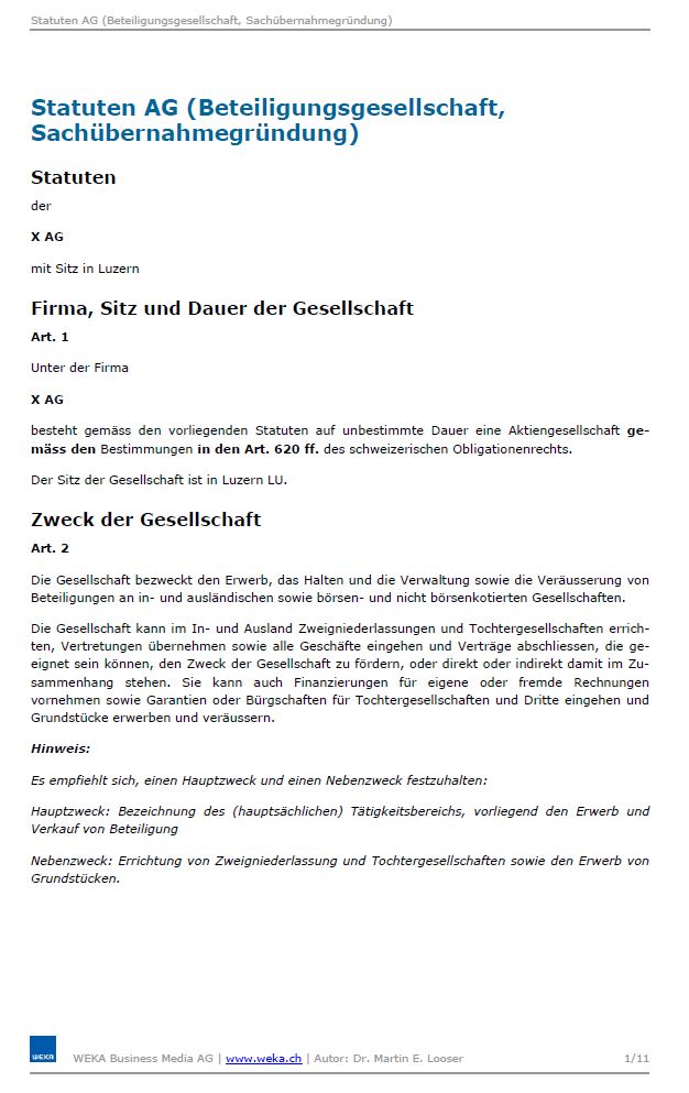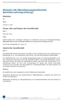 - Statuten AG (Beteiligungsgesellschaft, Sachübernahmegründung)