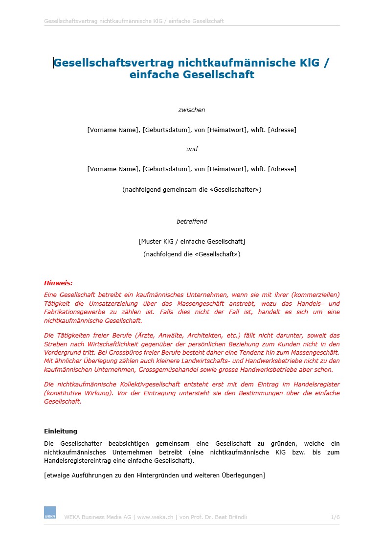 - Gesellschaftervertrag nichtkaufmännische KlG
