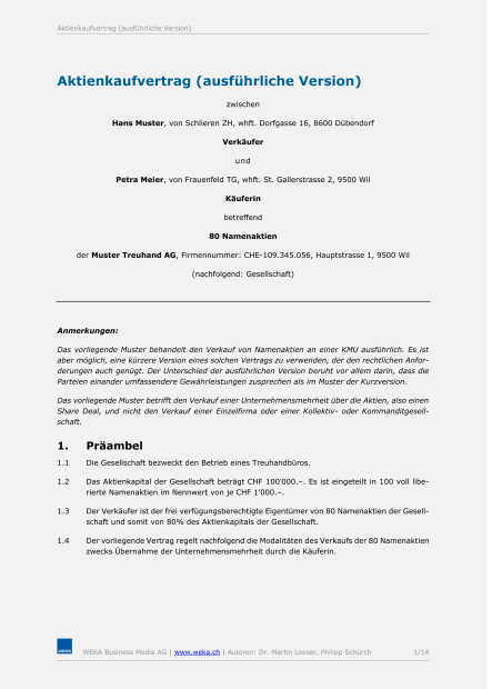 Anmerkungen: Dieses Muster behandelt den Kauf oder Verkauf von Namenaktien ausführlich. Es ist aber möglich, eine kürzere Version zu verwenden, die den rechtlichen Anforderungen auch genügt. Der Unterschied beruht vor allem darin, dass in der ausführlichen Version die Parteien einander umfassendere Gewährleistungen zusprechen. >> Zur Kurzversion