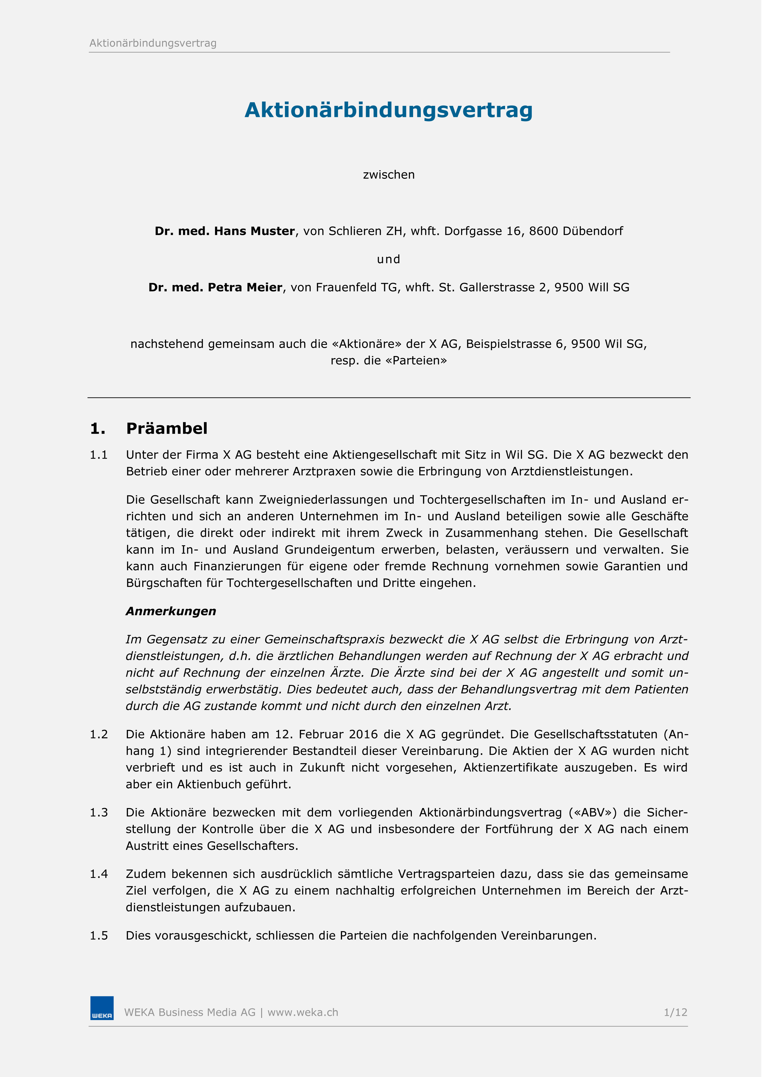 Ein Vertrag unter Aktionären hat sehr viele spezifische individuelle Regelungen, die von den Bedürfnissen der Aktionäre abhängen. Nichtsdestotrotz können Sie diese ausführliche Mustervorlage, die von Schweizer Rechtsanwälten geprüft wurde, als Grundlage dafür nutzen. Dieser Muster-Aktionärbindungsvertrag bezieht sich auf eine AG, die selbst Arztdienstleistungen erbringt.