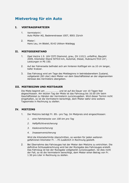 Bei einem Auto-Mietvertrag ist von zentraler Bedeutung, dass das Fahrzeug so genau wie möglich umschrieben wird und dass Elemente wie Reparaturen, Beschädigungen und Rückgabe der Mietsache schriftlich festgehalten werden. Mit dieser Vertragsvorlage ersparen Sie sich unnötigen Ärger und stehen garantiert auf der rechtssicheren Seite.