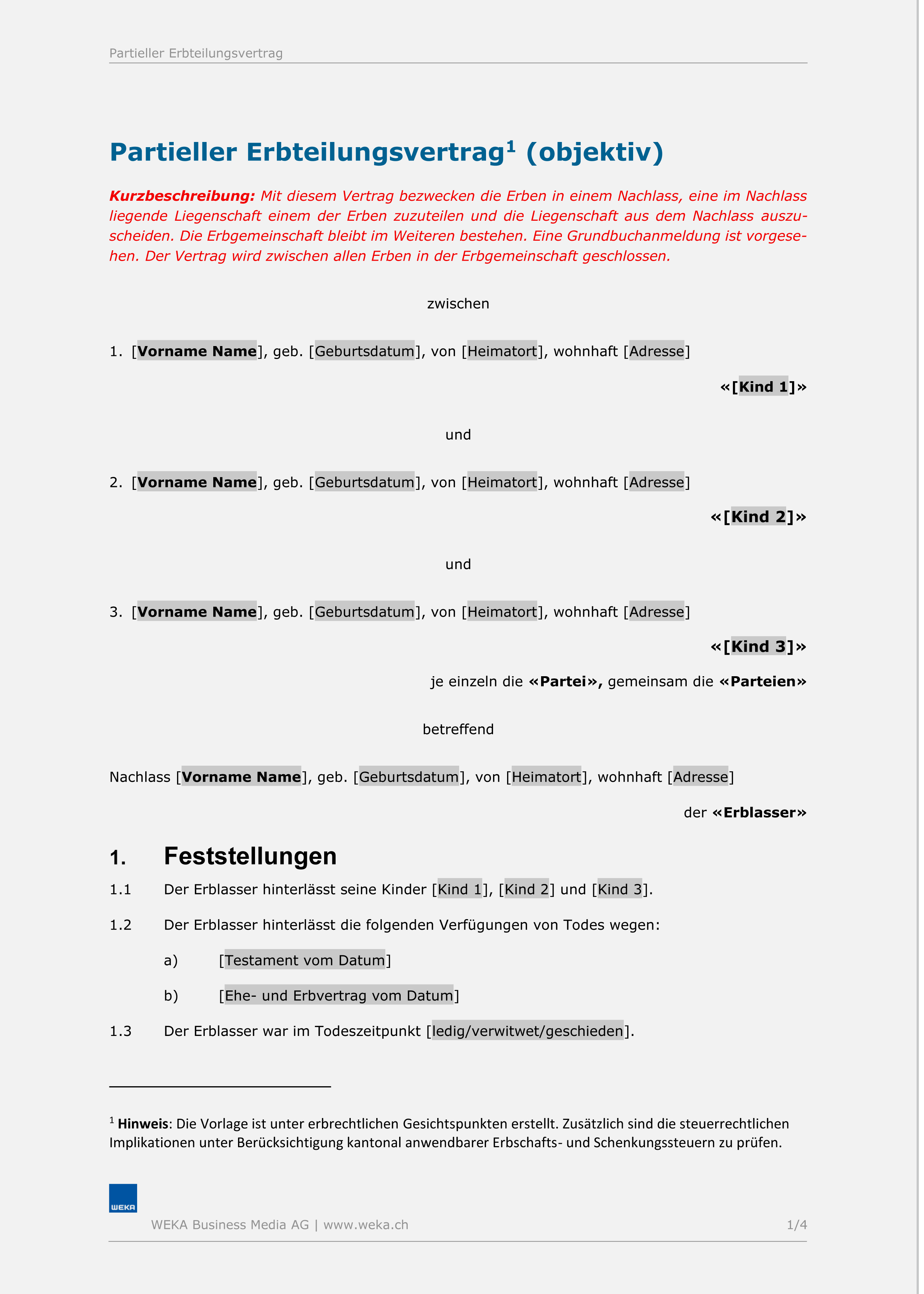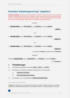 Mit einem objektiv-partiellen Erbteilungsvertrag bezwecken die Erben eines Nachlasses, eine im Nachlass liegende Liegenschaft einem der Erben zuzuteilen und die Liegenschaft aus dem Nachlass auszuscheiden. Die Erbgemeinschaft bleibt im Weiteren bestehen. Eine Grundbuchanmeldung ist vorgesehen. Der Vertrag wird zwischen allen Erben in der Erbgemeinschaft geschlossen.