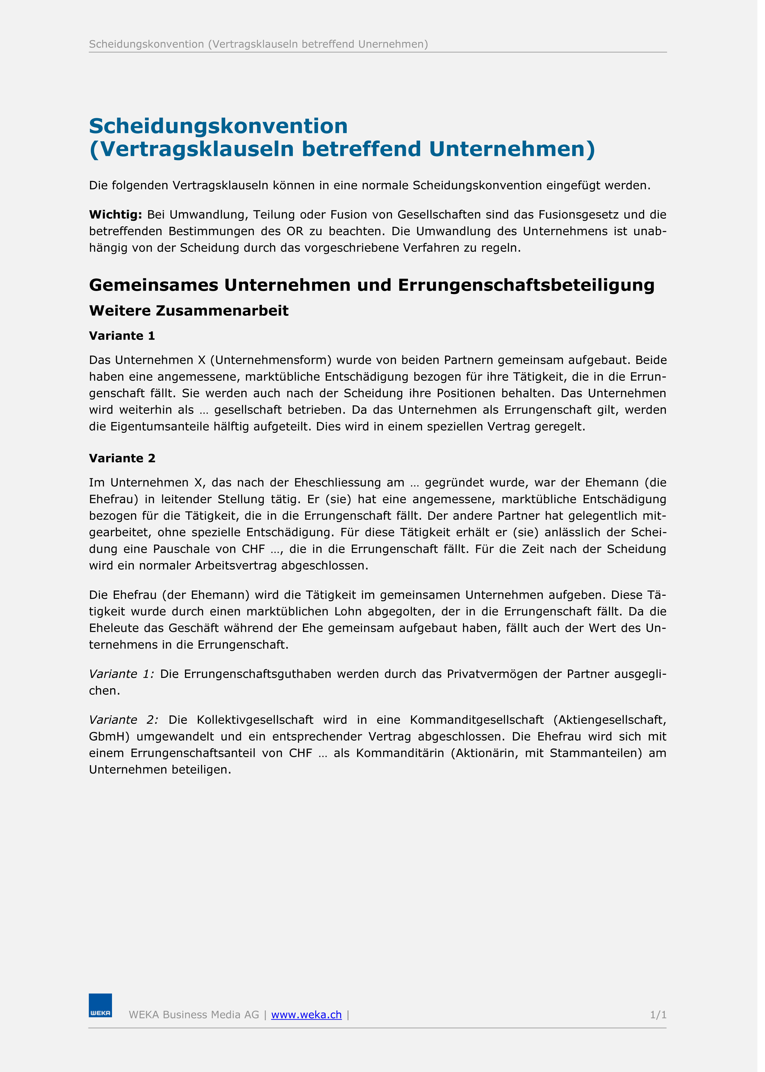 Wichtige Hinweise: Bei Umwandlung, Teilung oder Fusion von Gesellschaften aufgrund einer Scheidung sind das Fusionsgesetz und die betreffenden Bestimmungen des OR zu beachten. Die Umwandlung des Unternehmens ist unabhängig von der Scheidung durch das gesetzlich vorgeschriebene Verfahren zu regeln.