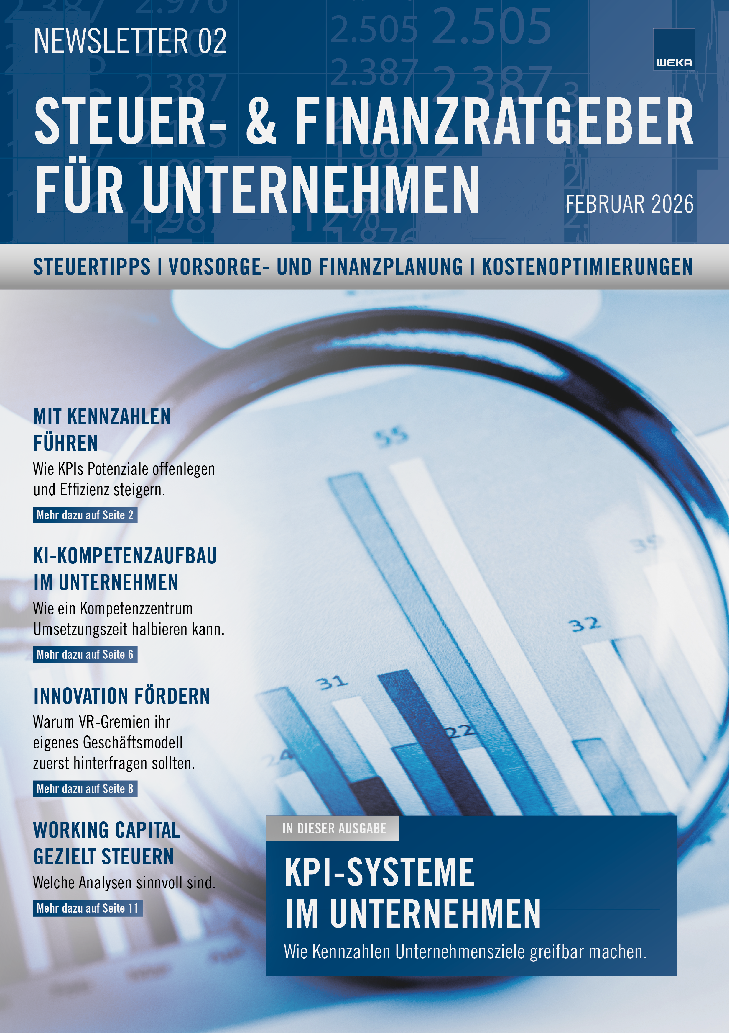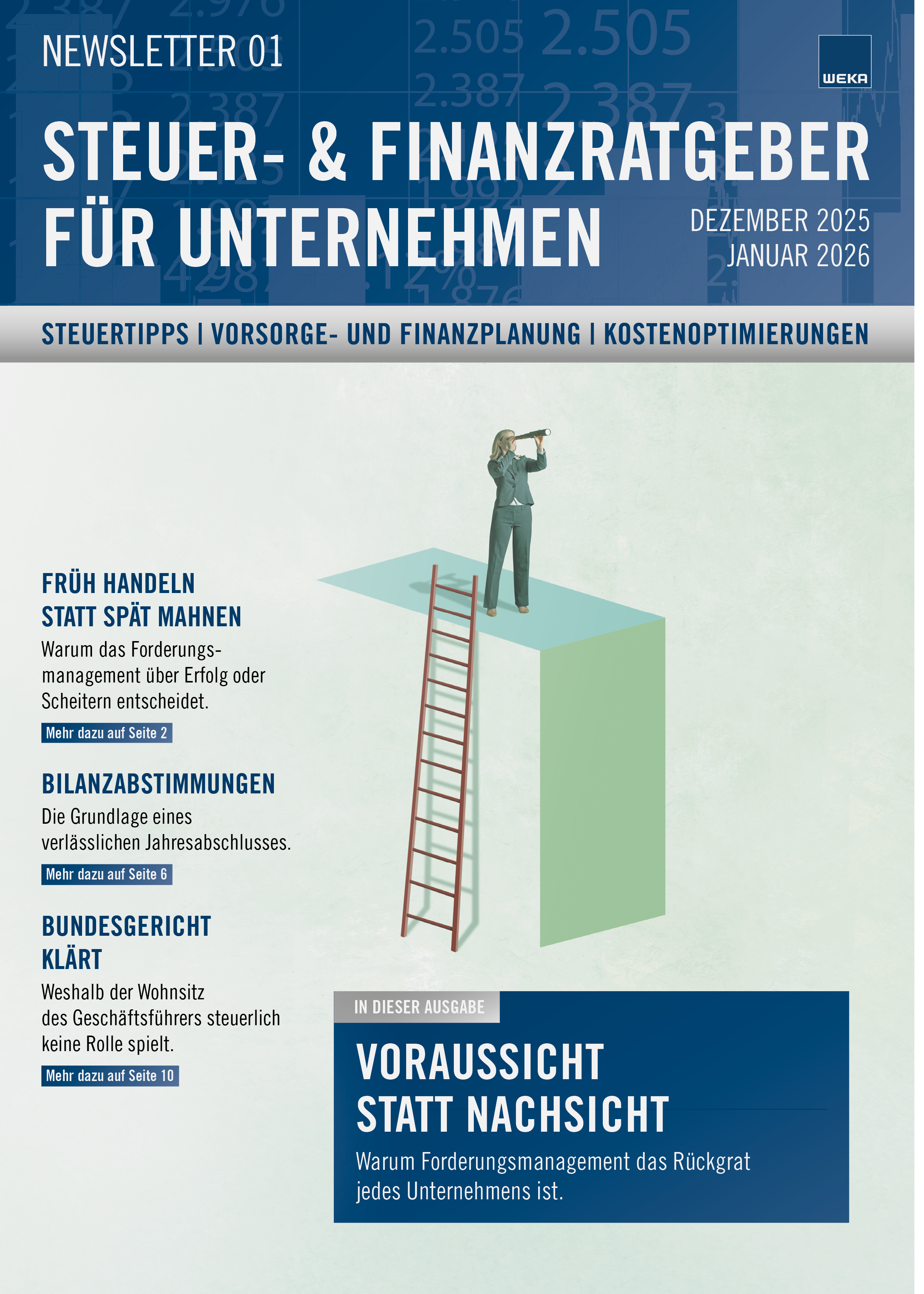 Welche steuerlichen und finanziellen Fragen sollten Sie in Ihrem Unternehmen im Auge behalten? Wo lauern finanzielle Risiken, die es zu vermeiden gilt? Unser Newsletter informiert Sie 10 mal jährlich mit knackigen, praxisorientierten Beiträgen und bringt die wichtigsten steuerlichen und finanziellen Themen in der Unternehmenspraxis auf den Punkt. So sind Sie in der Lage, Aufgaben und Problemfelder frühzeitig zu erkennen und dementsprechend zu handeln.