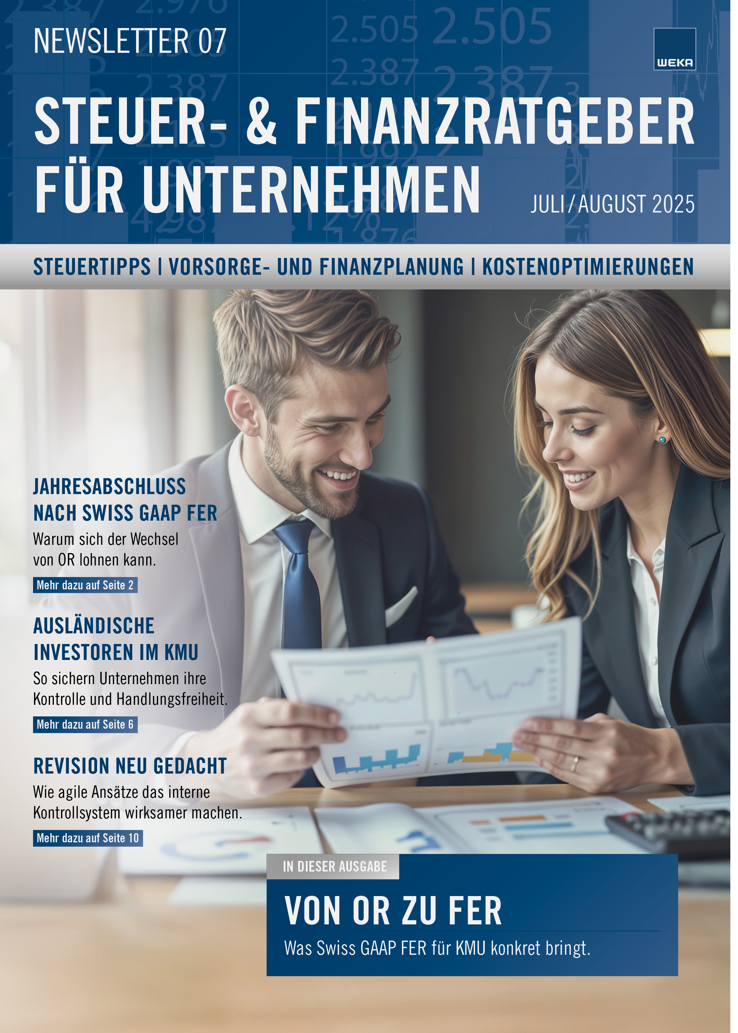 Tipp: Sichern Sie sich jetzt die digitalen Ausgaben der vier Finanz-Newsletter (Finanz- und Rechnungswesen, Mehrwertsteuer, Steuer- und Finanzratgeber für Unternehmen, Lohn und Sozialversicherungen) im Paket und sparen Sie CHF 150.- im Vergleich zu den Einzel-Abonnements. >> Zum Newsletter-Paket
