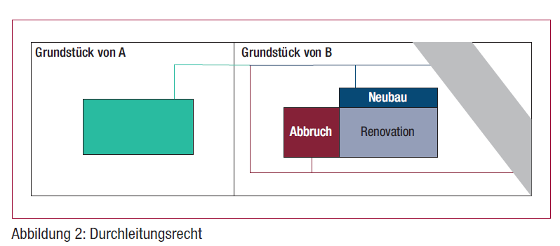 Oft kommt es vor, dass öffentliche und private Leitungen für Wasser, Abwasser, Gas, Fernwärme, Strom und Fernmeldedienste über private Grundstücke verlaufen. Solche Leitungen sind mit dem Boden fest verbunden, weshalb sie als Bauten i.S.v. Art. 667 Abs. 2 ZGB gelten. Der Eigentümer des Bodens, mit welchem die Leitungen verbunden sind, ist grundsätzlich auch deren Eigentümer (sog. Akzessionsprinzip). Zur Durchbrechung dieses Prinzips werden entsprechende Durchleitungsrechte begründet (Art. 676 Abs. 2 ZGB).