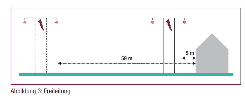 Im Fall von BGer 1C_647/2019 vom 8. Oktober 2020 war das betroffene Grundstück genügend gross, da die hypothetische Freileitung ausserhalb des Grundstücks knapp 60 m vom Wohnhaus entfernt war und damit im Wesentlichen geringere Immissionen auf das Wohnhaus hatte als die tatsächliche Freileitung mit einer Entfernung von nur 5 m vom Wohnhaus (siehe Abbildung 3).