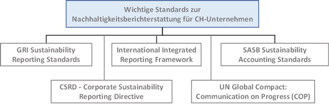 Diese Abbildung liefert einen Überblick zu den wichtigsten Standards der Nachhaltigkeitsberichterstattung für Schweizer Unternehmen.