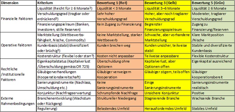 | Verhältnis zu Gläubigern / Stakeholdern | wenn die Gläubiger kooperationsbereit sind und Restrukturierungsmassnahmen mittragen | wenn Vertrauen bei Banken, Investoren oder Lieferanten irreparabel verloren ist |
