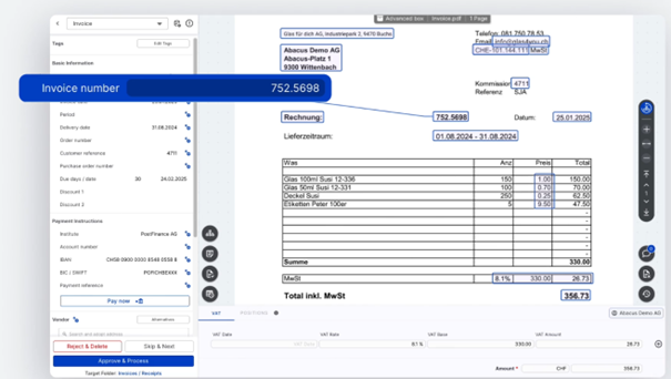 Das KI-Tool für Kreditoren-Workflow erkennt Rechnung und Details sowie Parameter. Je nach Setting kann die Software trainiert werden, um ähnliche oder identische Belege wiederzuerkennen und die Felder automatisch abzufüllen. Weiter kann auch ein direkter Zahlungsauftrag erstellt und exportiert werden, was den Kreditorenprozess weiter begradigt. Ob dies als Einzelfreigabe oder per gesammelter Zahlungsauftragsliste (meist pain.001-File) passiert, hängt vom Tool und von den Einstellungen ab. Wenn das Dokument erkannt und die Felder ausgefüllt sind, genehmigen Sie die Extraktion der Zahlen, und die Daten werden direkt in Ihr ERP übertragen und gebucht. Nach der Erkennung analysiert das System den Beleg und ordnet ihn automatisch einer Buchungskategorie zu. Dank sogenannter Memory-Effekte, also der Fähigkeit des Systems, wiederkehrende Muster zu erkennen und daraus zu lernen, werden wiederkehrende Lieferanten, Beträge oder Muster der Kontierungspraxis erkannt. So lernt das System mit jeder erfassten Rechnung dazu und kann bei bekannten Belegtypen immer präzisere Buchungsvorschläge machen. Die Informationen werden nicht nur einem Buchhaltungskonto, sondern bei Bedarf auch einer Kostenstelle, einem Projekt oder einem bestimmten Mitarbeitenden zugeordnet. Dadurch lassen sich Spesen, Materialkosten oder Dienstleistungen direkt dort erfassen, wo sie intern verursacht wurden. Beispielsweise wird eine Rechnung für Baumaterial automatisch dem zugehörigen Bauprojekt zugewiesen, während Spesenbelege einer bestimmten Abteilung oder einem Mitarbeitenden zugeordnet werden können.