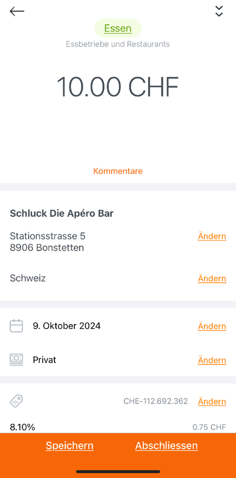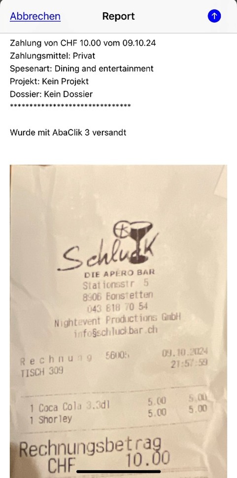 Nun kann der Beleg gespeichert bzw. exportiert werden (siehe Abbildung 5). Auch hier spielen wieder die Lösung und das Setting eine Rolle, im Optimalfall kann der Beleg in die ERP importiert werden und wird dabei zeitgleich automatisch verbucht. Selbstverständlich kann man dies noch Projekten oder Dossiers zuordnen. Dank der Rekapitulation der Spesendetails kann mit ChatGPT o.Ä. auch eine (Massen-)Buchungsvorlage erstellt werden, mit welcher die Buchungen ganz einfach in jedes gängige ERP importiert werden können. Der ganze Prozess ist mit nahezu jedem handelsüblichen Smartphone möglich.