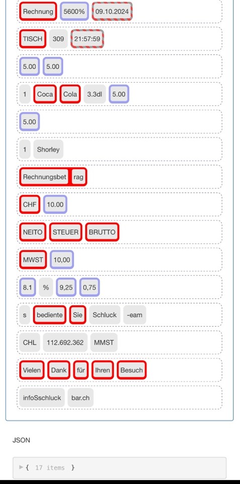 Hier haben wir noch das OCR-Protokoll (siehe Abbildung 4). Trotz des bereits einigermassen ramponierten Belegs konnte die OCR schon sehr viele Informationen richtig oder wenigstens annähernd ermitteln. Die KI hat die unlogischen Daten korrigiert und die restlichen Daten plausibilisiert.