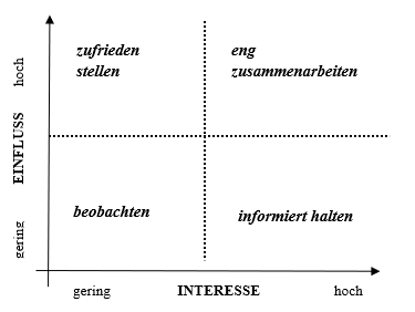 - vier Quadranten mit unterschiedlichen Schwerpunkten: Zufriedenstellen, eng zusammenarbeiten, beobachten und informiert halten,