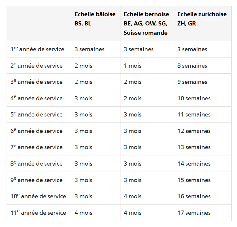 Conformément à l'article 324a CO, l'employeur doit continuer à verser le salaire pour une durée limitée. Les tribunaux ont développé à cet effet ce que l'on appelle des échelles, selon lesquelles ils fixent l'obligation de continuer à verser le salaire en fonction de l'ancienneté du travailleur. Il existe une échelle bernoise, une échelle bâloise et une échelle zurichoise. L'échelle zurichoise est utilisée par les tribunaux des cantons de Zurich, Schaffhouse et Thurgovie, l'échelle bâloise par les tribunaux des cantons de Bâle-Ville et Bâle-Campagne et l'échelle bernoise par les tribunaux des autres cantons. La durée du maintien du salaire en cas de maladie dépend donc du nombre d'années de service et du canton concerné.