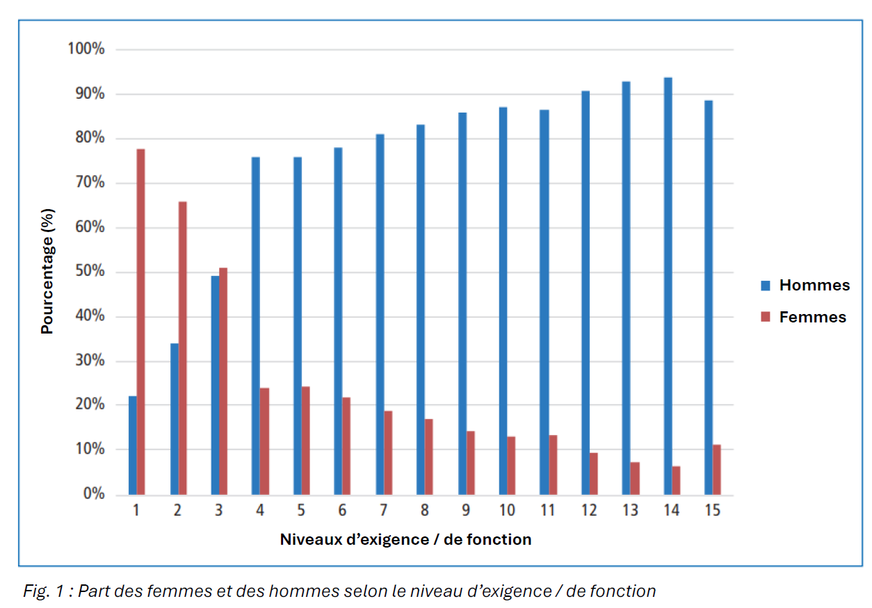 Existe-t-il des indices d’une éventuelle discrimination à l’embauche ou à la promotion ? Les femmes disposent-elles des mêmes possibilités de développement et de carrière ? Une analyse de plus de 150 000 données issues de la comparaison salariale L&M 2021 donne une image saisissante. La figure 1 présente la répartition femmes-hommes selon 15 niveaux d’exigence et de fonction (1 = plus faible exigence / 15 = plus élevée).