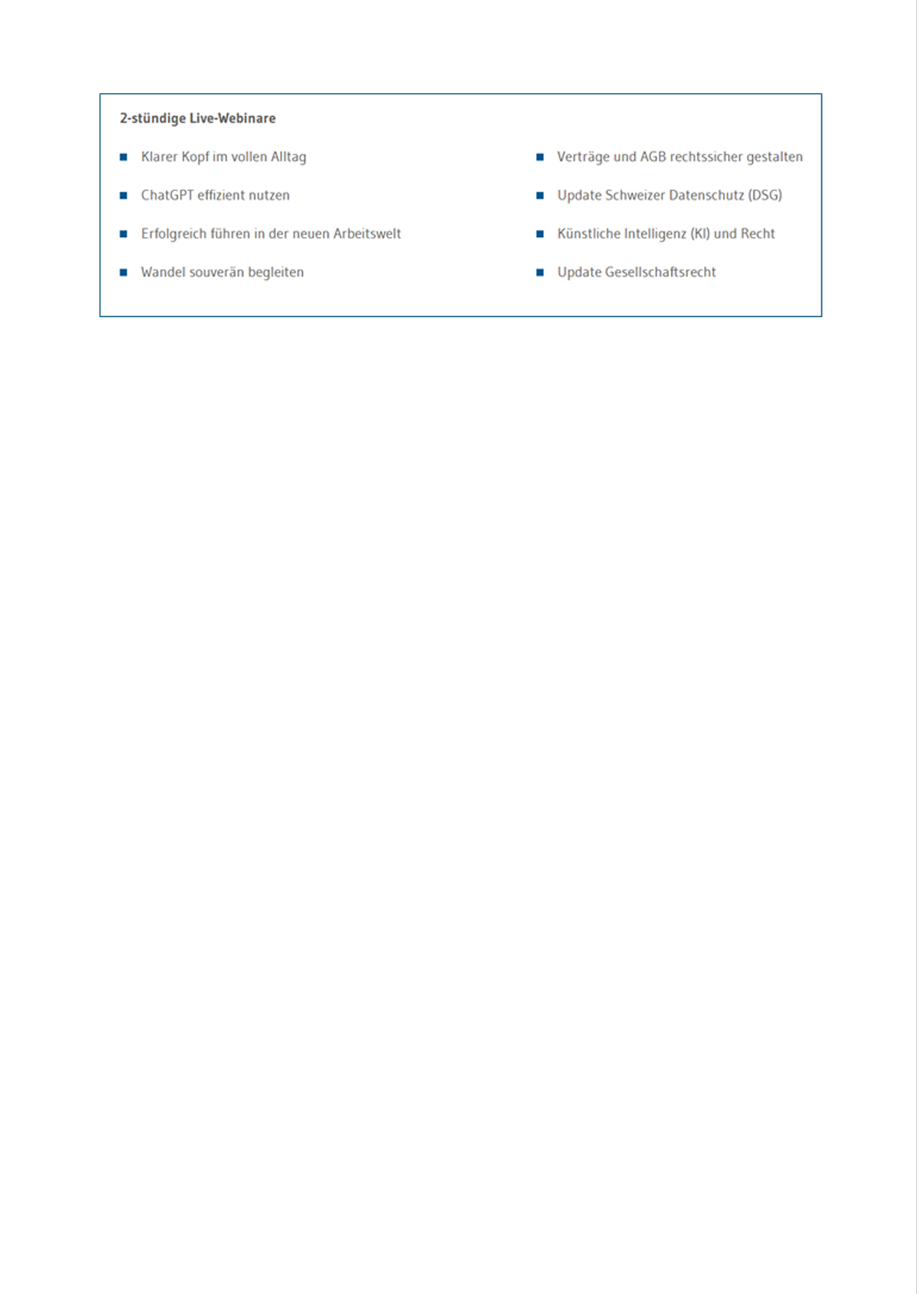 Damit Sie bei Ihrer Arbeit immer auf dem neusten Stand sind, haben Sie freien Zugang zu allen zweistündigen Live-Webinaren auf unserer Wissensplattform weka.ch. Weil unsere Kundinnen und Kunden die Präsenzveranstaltungen und das Networking vor Ort schätzen, beinhaltet diese Membership auch einen Seminargutschein im Wert von CHF 400.00 für alle Weiterbildungsangebote auf Praxisseminare.ch. So können Sie Ihr Fachwissen regelmässig vertiefen und sich persönlich mit Expertinnen und Experten sowie Teilnehmenden austauschen.